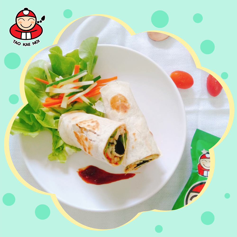4. Prepare the cooked tortillas, apply the tomato sauce around the whole piece. Then, put the green oak, carrots, cucumbers, Taokaenoi big roll and chicken on the tortillas.